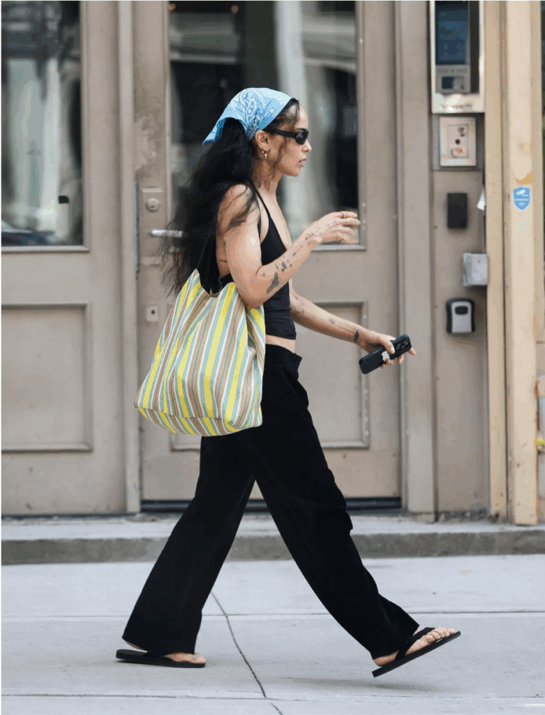 She boldly eschews shorts for wide-leg trousers, evoking a ’90s-inspired look. The low-rise waist and extra-long hem emphasize her sleek silhouette. Paired with a simple black satin cropped vest and an affordable silk scarf, she exudes a street-inspired yet sophisticated vibe. Retro silver cap-toed sunglasses and a small silver necklace add a sophisticated touch to the look.