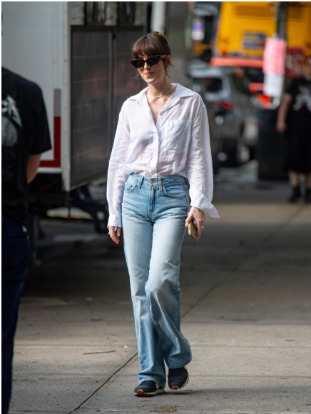 While enjoying comfort, Dakota also adds vintage elements to her wardrobe, such as baggy jeans, satin tops, and printed skirts, creating an elegant yet playful look.