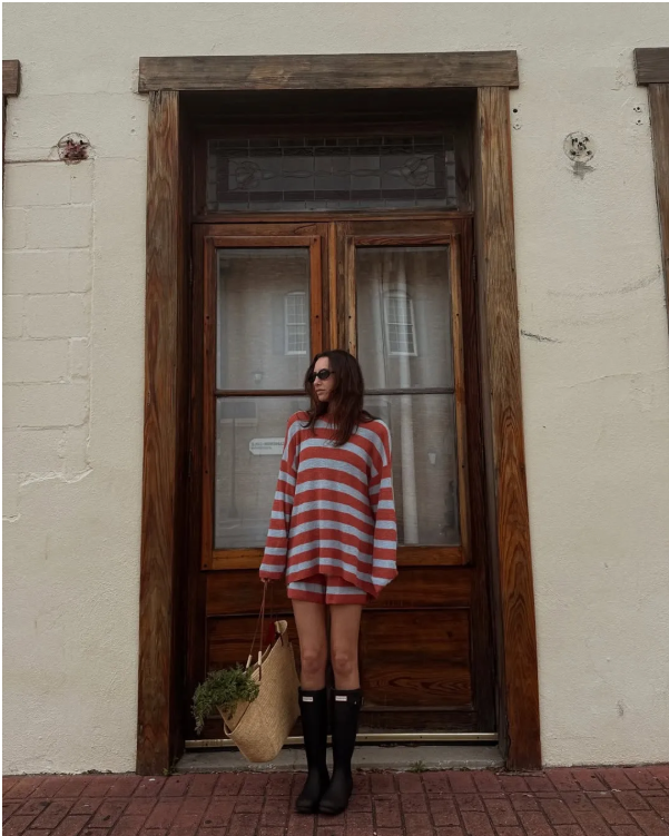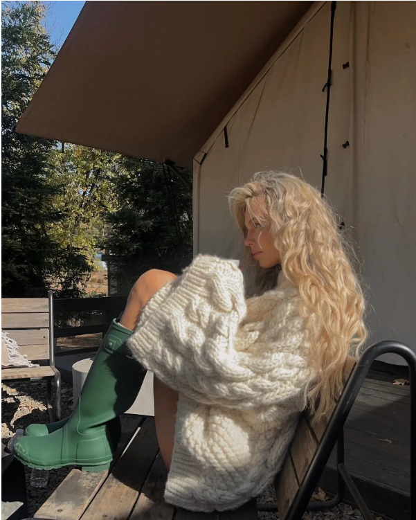 Black or cherry red Hunter boots, slouched over a miniskirt and chunky knit socks, echo Kate Moss’s music festival style, exuding a rebellious and free-spirited spirit.