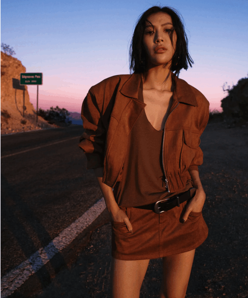 Editors unanimously praised the suede jacket for its comfort and style, with its wide shoulders and high-quality fabric being particularly eye-catching. The short skirt, combined with the safety pants design, strikes a balance between sexiness and practicality. The overall style is effortless and recognizable, perfect for everyday wear and special occasions.